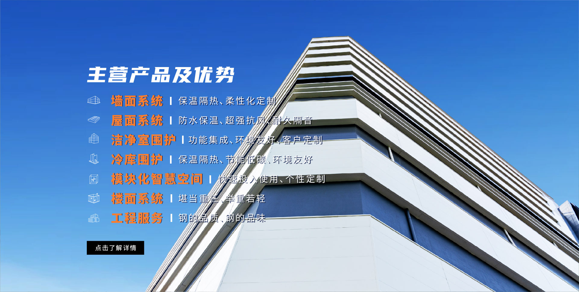 墻面系統(tǒng) 屋面系統(tǒng) 樓面系統(tǒng) 建筑鋼結構 潔凈室圍護 冷庫圍護 得默產(chǎn)品系列 全面解決方案